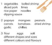 1. I’m Thuy, and I’m from Vietnam. Summer rolls are healthy and a very popular food from my country. They are made with fresh vegetables and boiled shrimp or sliced pork. All the ingredients are rolled together in rice paper. They are dipped in a dipping sauce.