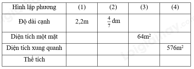 Diện tích xung quanh của hình lập phương là: $\frac{4}{7} \times \frac{4}{7} \times 4 = \frac{{64}}{{49}}$ (dm2)