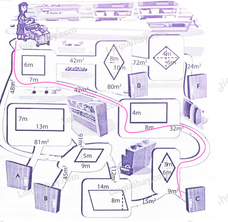 Tính diện tích mỗi hình tứ giác trên đường đi để tìm đường ra khỏi siêu thị.
