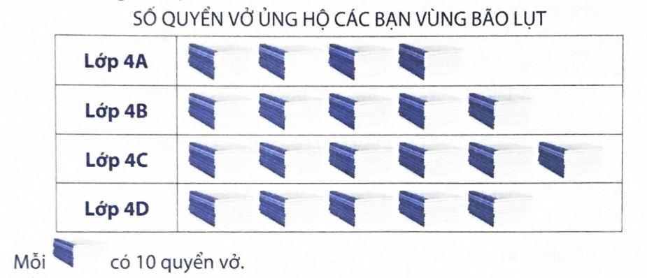 Biểu đồ dưới đây nói về số quyển vở khối lớp Bốn quyên góp được để ủng hộ các bạn vùng bão lụt.