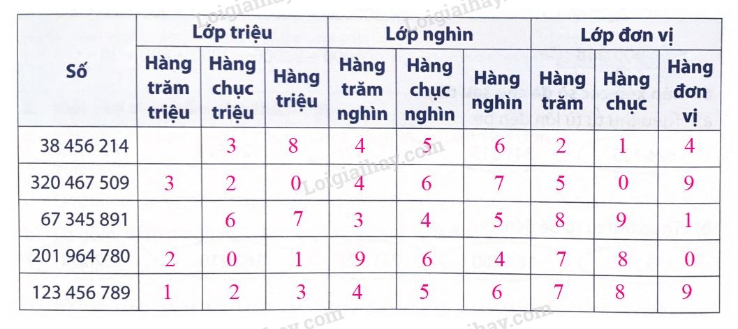 Các chữ số từ phải sang trái lần lượt thuộc hàng đơn vị, hàng chục, hàng trăm, hàng nghìn, hàng chục nghìn, hàng trăm nghìn, hàng triệu, hàng chục triệu, hàng trăm triệu, …
