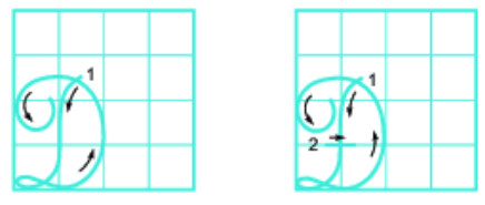 + Bước 1: Đặt bút dưới ĐK ngang 4, trước ĐK dọc 3, viết một nét móc ngược trái sát ĐK dọc 2 và hơi lượn vòng khi bắt đầu đến ĐK ngang 1 và kết hợp viết nét thắt tiếp xúc với ĐK ngang 1.
