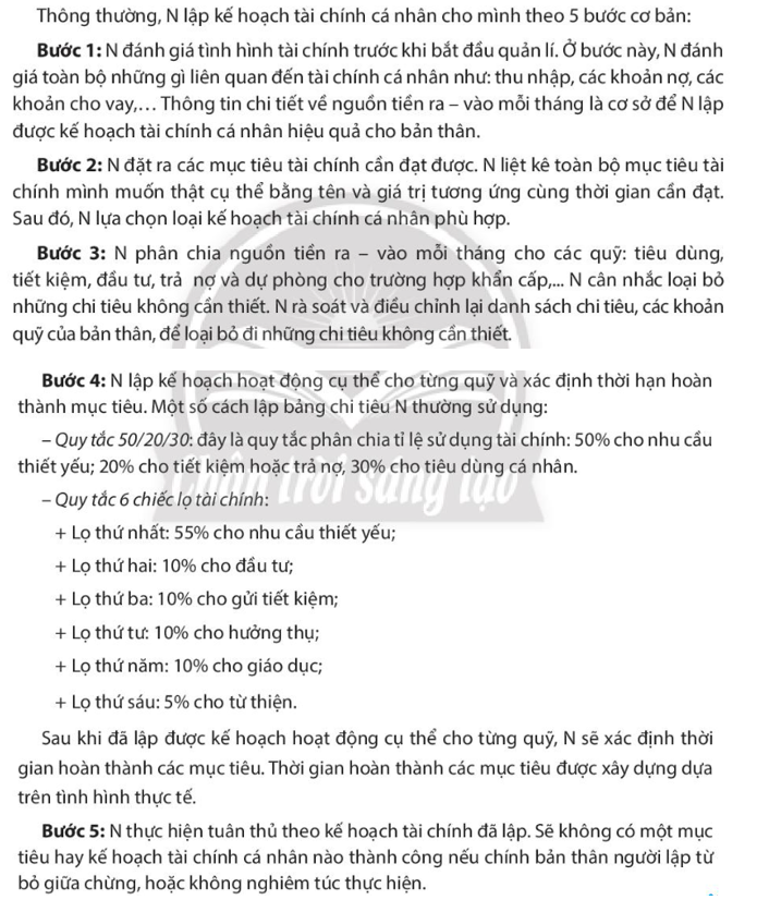 – Dựa vào các bước lập kế hoạch tài chính cá nhân của N, đưa ra nhận xét hợp lí hay không hợp lí về các bước lập kế hoạch tài chính cá nhân đó. Giải thích vì sao lại đưa ra nhận xét như vậy.