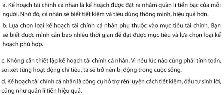 b – Em đồng tình với ý kiến này vì lựa chọn loại kế hoạch tài chính cá nhân phụ thuộc vào mục tiêu tài chính của cá nhân, việc đặt ra mục tiêu sẽ là căn cứ để lựa chọn kế hoạch phù hợp và xác định thời gian hoàn thành mục tiêu.