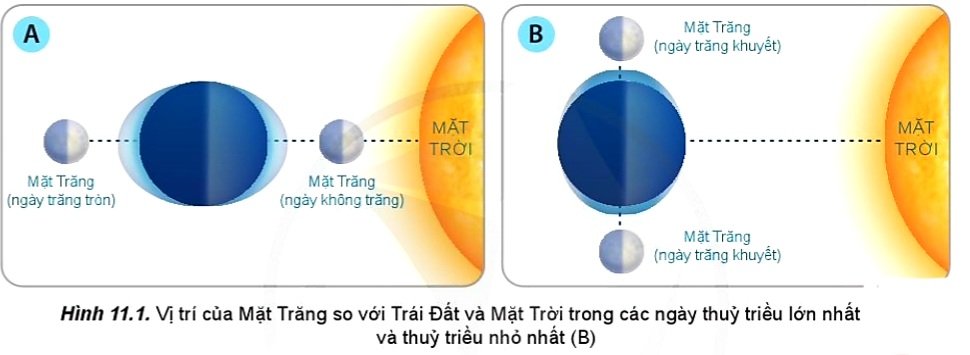 Đọc thông tin trong mục “Thủy triều” và quan sát hình 11.1 (chú ý vị trí của Mặt Trời, Trái Đất và Mặt Trăng).
