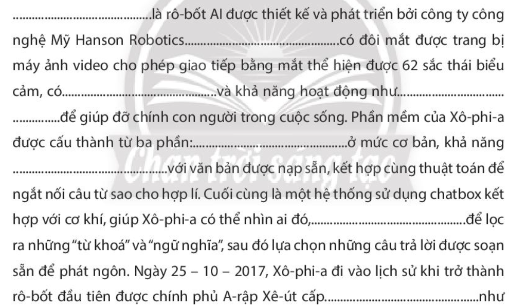 Câu 1. Điền vào bài viết những thông tin cho sẵn về rô-bốt Al Xô-phi-a (robot Al Sophia). Em suy nghĩ như thế nào về quan niệm gia đình của cô ấy? Chọn các từ hoặc cụm từ dưới đây, điền vào chỗ trống (…) cho phù hợp.