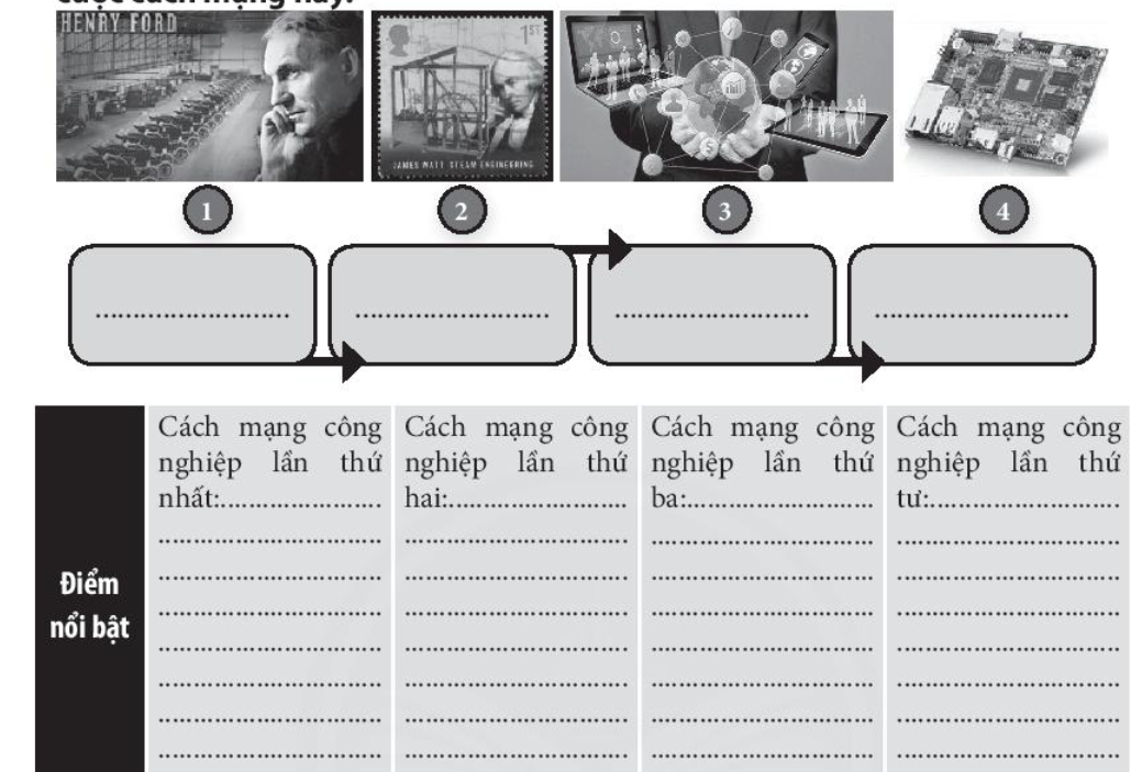 Câu 4. Sắp xếp các hình ảnh dưới đây theo đúng tiến trình phát triển của 4 cuộc cách mạng công nghiệp trên thế giới. Nêu điểm nổi bật của từng cuộc cách mạng này.
