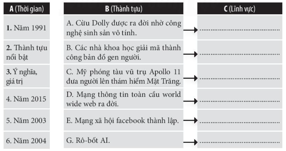 Câu 5. Hãy nối thời gian ở cột A cho phù hợp với thành tựu cách mạng công nghiệp ở cột B và xác định thành tựu đó thuộc lĩnh vực nào ở cột C.