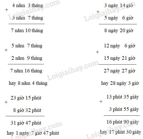 4 năm 3 tháng + 3 năm 7 tháng                  3 ngày 14 giờ + 5 ngày 6 giờ