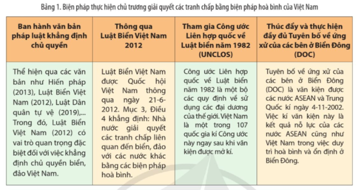 Bước 2: Quan sát Bảng 1 để biết được các biện pháp thực hiện chủ trương giải quyết các tranh chấp bằng biện pháp hoà bình của Việt Nam.
