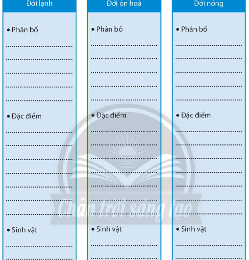 Hãy điền thông tin phù hợp với đặc điểm của các đới thiên nhiên ở Bắc Mỹ vào bảng dưới đây: