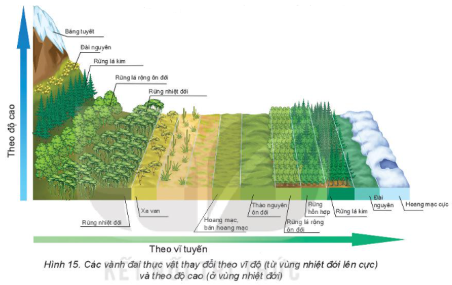 Quan sát hình 15 (Chú ý sự thay đổi của thảm thực vật theo độ cao và theo vĩ độ).