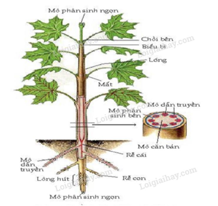 Ở cây Hai lá mầm, tính từ ngọn đến rễ là các loại mô phân sinh theo thứ tự: mô phân sinh đỉnh ngọn → mô phân sinh bên →  mô phân sinh đỉnh rễ