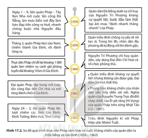 1. Dựa vào sơ đồ hình 17.2, nêu nét chính về quá trình thực dân Pháp xâm lược ViệtNam và cuộc kháng chiến chống Pháp của quân dân ta từ năm 1858 đến năm 1862.