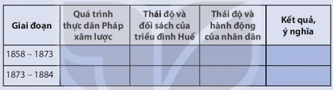 Lập và hoàn thành bảng hệ thống (theo gợi ý dưới đây) về quá trình thực dân Pháp xâm lược Việt Nam và cuộc kháng chiến chống xâm lược của nhân dân ta (1858-1884).