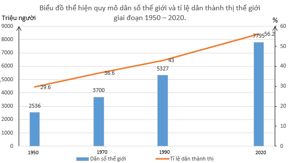 b) Vẽ biểu đồ kết hợp (cột và đường) thể hiện quy mô dân số thế giới và tỉ lệ dân thành thị thế giới giai đoạn 1950 – 2020.