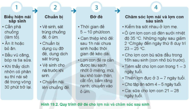 Hãy mô tả các bước của quy trình đỡ đẻ, chăm sóc lợn nái và lợn con sau sinh có trong hình 18.2