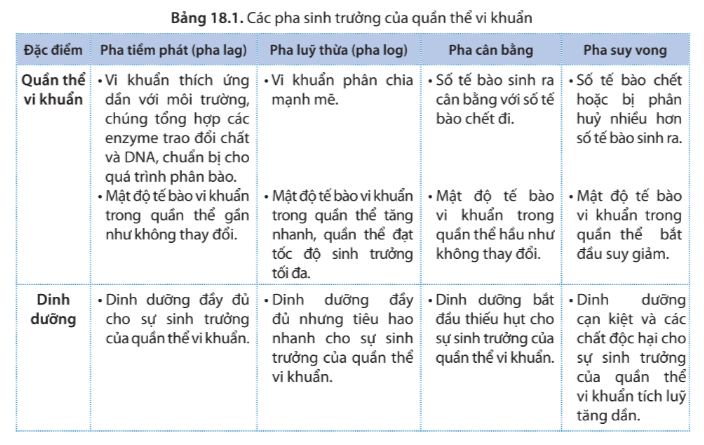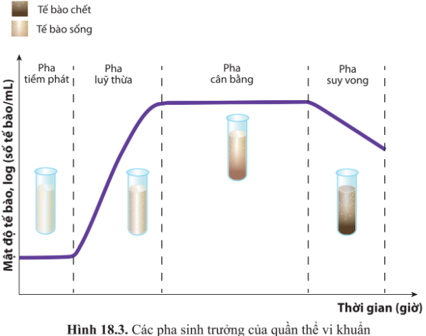 a) Ở pha tiềm phát chất dinh dưỡng đầy đủ mà mật độ quán thế vi khuẩn gần như không thay đổi vì vi khuẩn đang dần thích ứng với môi trường mới do đó số lượng tế bào sinh ra bằng số lượng tế bào chết đi do không thích ứng được với môi trường.