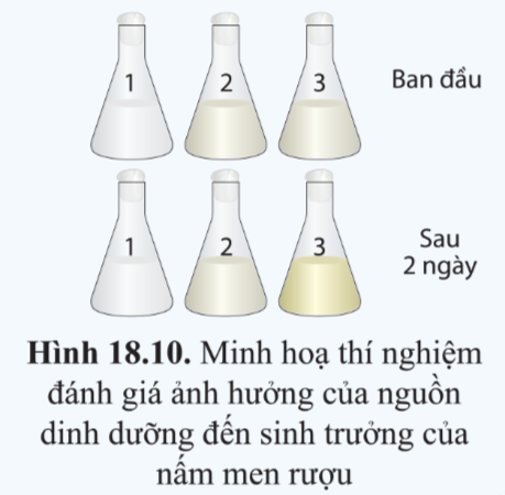 Thí nghiệm đánh giá ảnh hưởng của nguồn dinh dưỡng (đường sucrose) đến sinh trưởng của nấm men rượu S.cerevisiae được bố trí trong 3 bình tam giác đều chứa 10 mL dung dịch 1 % (NH4)2SO4, và bổ sung thêm: 0,5 g sucrose (binh 1); 10 tế bào nấm men (bình 2); 0,5 g sucrose và 106 tế bào nấm men (bình 3) . Sau hai ngày để ở nhiệt độ phòng thu được kết quả như hình 18.10. Dựa vào cách bố trí thí nghiệm và kết quả thí nghiệm (hình 18.10) cho biết: Tại sao bình 3 có hiện tượng đục lên sau hai ngày còn bình 1 và không có hiện tượng này ?