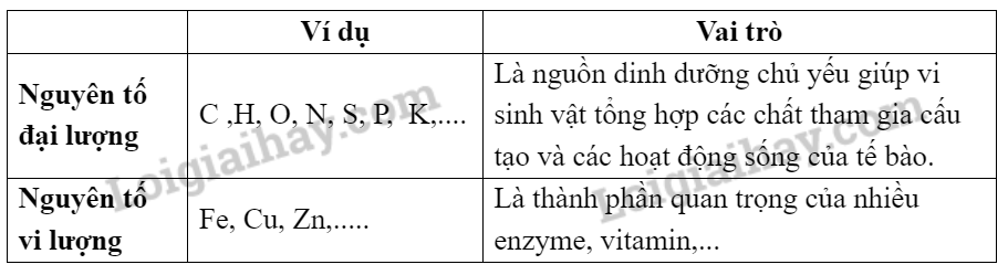 Luyện tập 3: Kể tên các nguyên tố đại lượng mà vi sinh vật sử dụng trong nguồn thức ăn của chúng. Nếu vai trò chính yếu của các nguyên tố này đối với vi sinh vật.