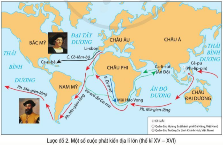 Đọc thông tin và quan sát lược đồ 2, bảng 2, hãy trình bày những nét chính về hành trình của một số cuộc phát kiến địa lí lớn.