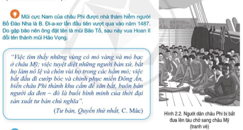 – Năm 1487, B. Đi-a-xơ đi tới được mỏm cực Nam châu Phi thì bị bão tố đẩy ra xa bờ, khi quay lai, đoàn bất ngờ đi vòng qua điểm cực Nam của lục địa châu Phi và đặt tên nó là mũi Bão Tố, về sau được đổi thành mũi Hảo Vọng.