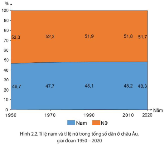 Giai đoạn 1950 – 2020, cơ cấu dân số theo giới tính của châu Âu có sự chênh lệch (tỉ lệ nữ cao hơn nam), nhưng đang có sự thay đổi (giảm tỉ lệ dân số nữ, tăng tỉ lệ dân số nam).