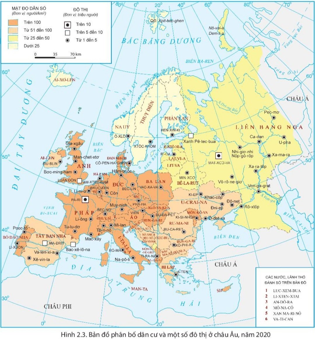Đọc thông tin trong mục 3 (Đô thị hóa ở châu Âu) và quan sát hình 2.3 (đọc bảng chú giải để biết các kí hiệu đô thị quy mô trên 5 triệu dân, sau đó tìm tên các đô thị trên bản đồ).