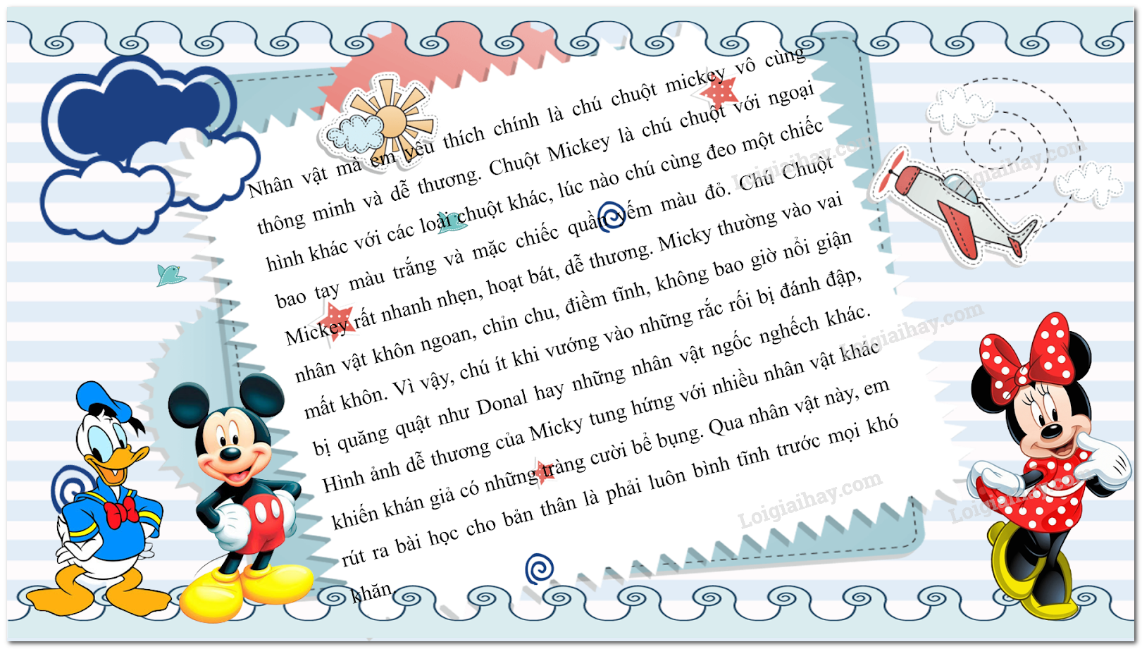Nhân vật mà em yêu thích chính là chú chuột mickey vô cùng thông minh và dễ thương. Chuột Mickey là chú chuột với ngoại hình khác với các loài chuột khác, lúc nào chú cùng đeo một chiếc bao tay màu trắng và mặc chiếc quần yếm màu đỏ. Chú Chuột Mickey rất nhanh nhẹn, hoạt bát, dễ thương. Micky thường vào vai nhân vật khôn ngoan, chỉn chu, điềm tĩnh, không bao giờ nổi giận mất khôn. Vì vậy, chú ít khi vướng vào những rắc rối bị đánh đập, bị quăng quật như Donal hay những nhân vật ngốc nghếch khác. Hình ảnh dễ thương của Micky tung hứng với nhiều nhân vật khác khiến khán giả có những tràng cười bể bụng. Qua nhân vật này, em rút ra bài học cho bản thân là phải luôn bình tĩnh trước mọi khó khăn.