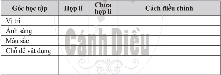 – Quan sát góc học tập của em, xác định những điểm hợp lí và chưa hợp lí.