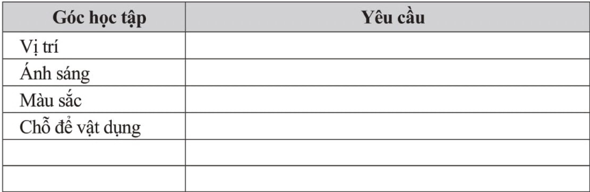 Hãy xây dựng một bản gợi ý cách sắp xếp góc học tập với các nội dung sau: