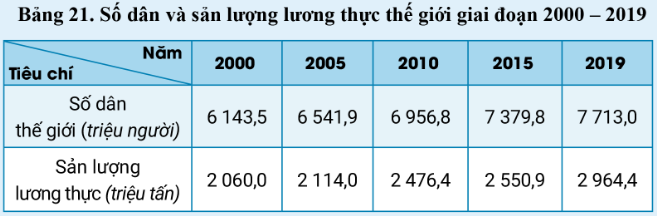 a. Hãy vẽ biểu đồ kết hợp (cột và đường) thể hiện số dân và sản lượng lương thực của thế giới giai đoạn 2000 – 2019.