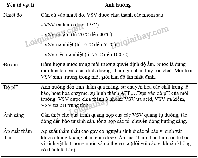 + Yếu tố vật lí: Nhiệt độ, độ ẩm, độ pH, ánh sáng, áp suất thẩm thấu.
