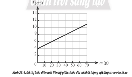 Một lò xo được treo thẳng đứng. Lần lượt treo vào đầu còn lại của lò xo các vật có khối lượng m thay đổi thì chiều dài l của lò xo cũng thay đổi theo. Mối liên hệ giữa chiều dài và khối lượng vật được treo vào lò xo được thể hiện trong đồ thị Hình 23.4. Lấy g = 9,8 m/s2.