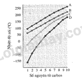 Đồ thị hình bên mô tả sự phụ thuộc giá trị nhiệt độ sôi vào số nguyên tử carbon của bốn loại hợp chất là alkane, alcohol, aldehyde và carboxylic acid. Đồ thị A, B, C, D lần lượt tương ứng với các loại hợp chất là