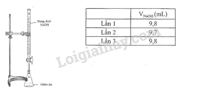 \(\begin{array}{l}{\overline {\rm{V}} _{{\rm{NaOH}}}} = \frac{{9,8 + 9,7 + 9,8}}{3} \approx 9,767{\rm{ (mL)}}\\ \Rightarrow {{\rm{n}}_{{\rm{NaOH}}}} = 9,767 \times {10^{ – 3}} \times 0,1 = 9,767 \times {10^{ – 4}}({\rm{mol}})\end{array}\)