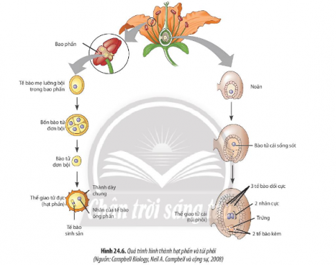 Quan sát Hình 24.6, hãy mô tả quá trình hình thành hạt phấn và túi phôi. Hai quá trình này có đặc điểm gì khác nhau?