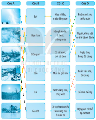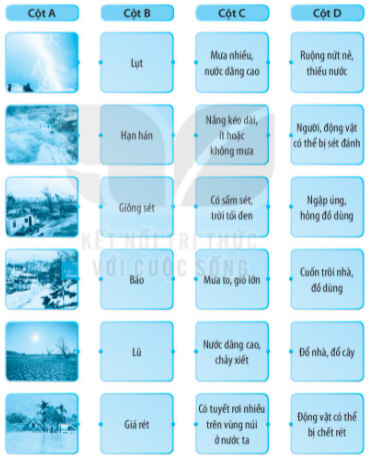 1. Nối mỗi hình ở cột A với các cụm từ ở cột B, C, D cho phù hợp. 2. Nối (theo mẫu): 3. Viết thông tin về thiên tai em đã tìm hiểu được vào chỗ (…) trong sơ đồ dưới đây. 4. Đọc nội dung trang 110 SGK về thiên tai đã xảy ra ở nước ta và hoàn thành nội dung sau: