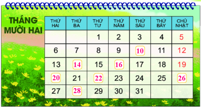 b) Xem tờ lịch tháng 12 rồi trả lời câu hỏi.