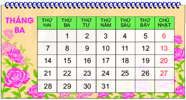 Xem tờ lịch tháng 3 dưới đây rồi trả lời câu hỏi.