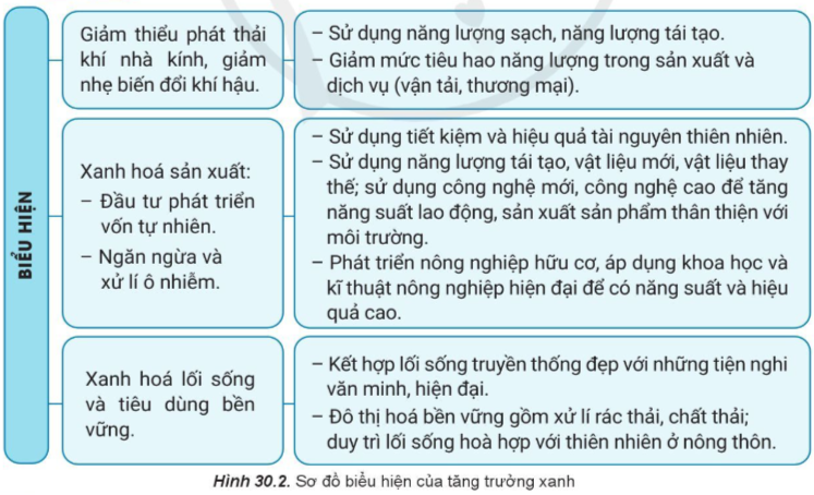 Đọc thông tin và quan sát hình 30.2, hình 30.3, hãy trình bày khái niệm và biểu hiện của tăng trưởng xanh.