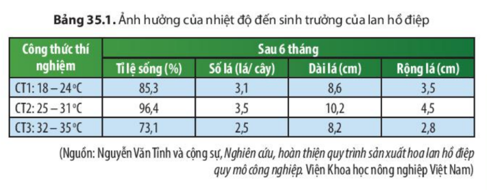 2. Từ Bảng 35.1. nêu ảnh hưởng của nhiệt độ đến tỉ lệ sống, số lá, độ dài, bề rộng lá của cây lan hồ điệp