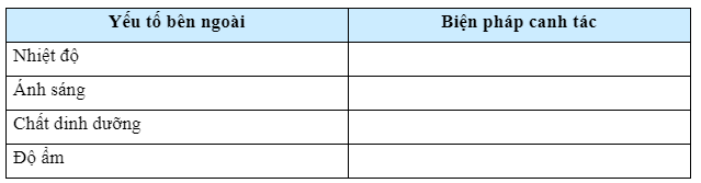 Vận dụng kiến thức về ảnh hưởng của các yếu tố bên ngoài tác động đến quá trình sinh trưởng và phát triển của thực vật, hãy đề xuất các biện pháp canh tác giúp cây trồng sinh trưởng tốt, cho năng suất cao theo mẫu sau: