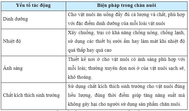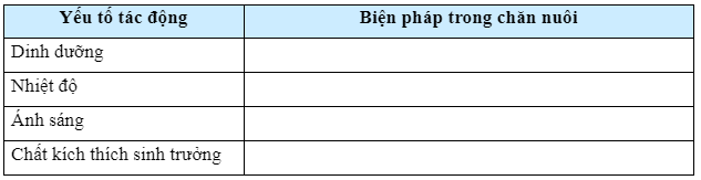 Vận dụng kiến thức về các yếu tố ảnh hưởng đến sinh trưởng và phát triển của sinh vật, em hãy đề xuất biện pháp trong chăn nuôi để vật nuôi sinh trưởng tốt, cho năng suất cao theo mẫu sau:
