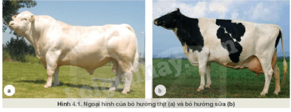 Quan sát Hình 4.1 và chỉ ra những đặc điểm đặc trưng về ngoại hình khi chọn giống bò hướng thịt và bò hướng sữa.