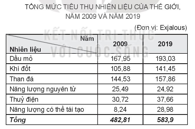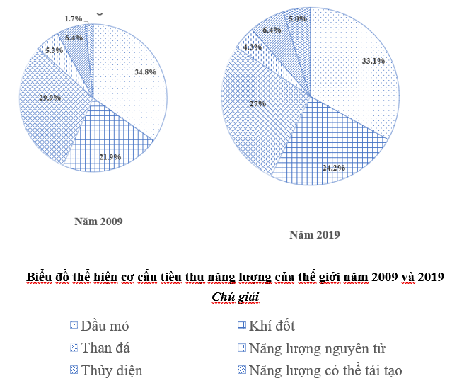 – Nhận xét sự thay đổi cơ cấu tiêu thụ năng lượng thế giới năm 2019 so với 2009.