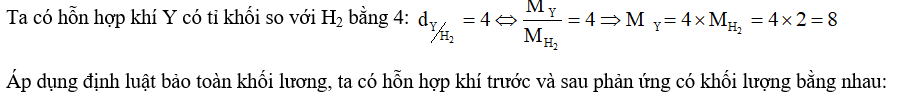 \(\begin{array}{l}{\rm{ }}{{\rm{m}}_{\rm{X}}} = {{\rm{m}}_{\rm{Y}}}\\ \Leftrightarrow {{\rm{m}}_{{{\rm{N}}_{\rm{2}}}}} + {{\rm{m}}_{{{\rm{H}}_{\rm{2}}}}} = {{\rm{m}}_{\rm{Y}}}\\ \Leftrightarrow 1 \times 28 + 4 \times 2 = 8 \times (5 – 2{\rm{x}})\\ \Rightarrow {\rm{x}} = 0,25{\rm{ (mol)}}\end{array}\)