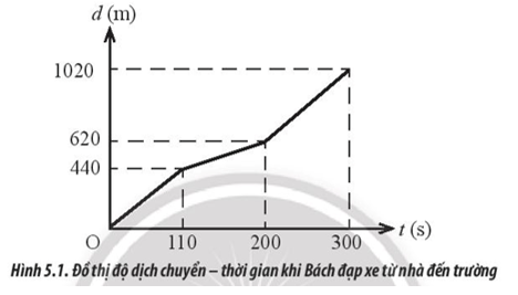 Nhà của Bách và trường nằm trên cùng một con đường nên hàng ngày Bách đều đi học bằng xe đạp từ nhà đến trường với tốc độ không đổi bằng 4 m/s (khi trời lặng gió). Trong một lần Bách đạp xe từ nhà đến trường, có một cơn gió thổi ngược chiều trong khoảng thời gian 90 s. Hình 5.1 mô tả đồ thị dịch chuyển – thời gian của Bách trong 5 phút đầu tiên. Tốc độ của gió so với mặt đất là bao nhiêu?