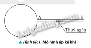 Một mô hình áp kế khí (Hình 6P.1) gồm một bình cầu thủy tinh có thể tích 270 cm3 gắn với một ống nhỏ AB nằm ngang có tiết diện 0,1 cm2. Trong ống có một giọt thủy ngân. Ở 0 °C giọt thủy ngân cách A 30 cm. Tính khoảng di chuyển của giọt thủy ngân khi hơ nóng bình cầu đến 10 °C. Coi thể tích bình là không đổi.
