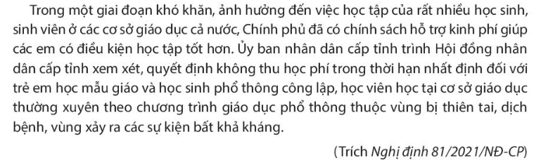 Em hãy chia sẻ suy nghĩ của em về chính sách hỗ trợ, không thu học phí của Chính phủ trong thông tin trên. Theo em, khoản kinh phí hỗ trợ trên được trích từ nguồn nào?